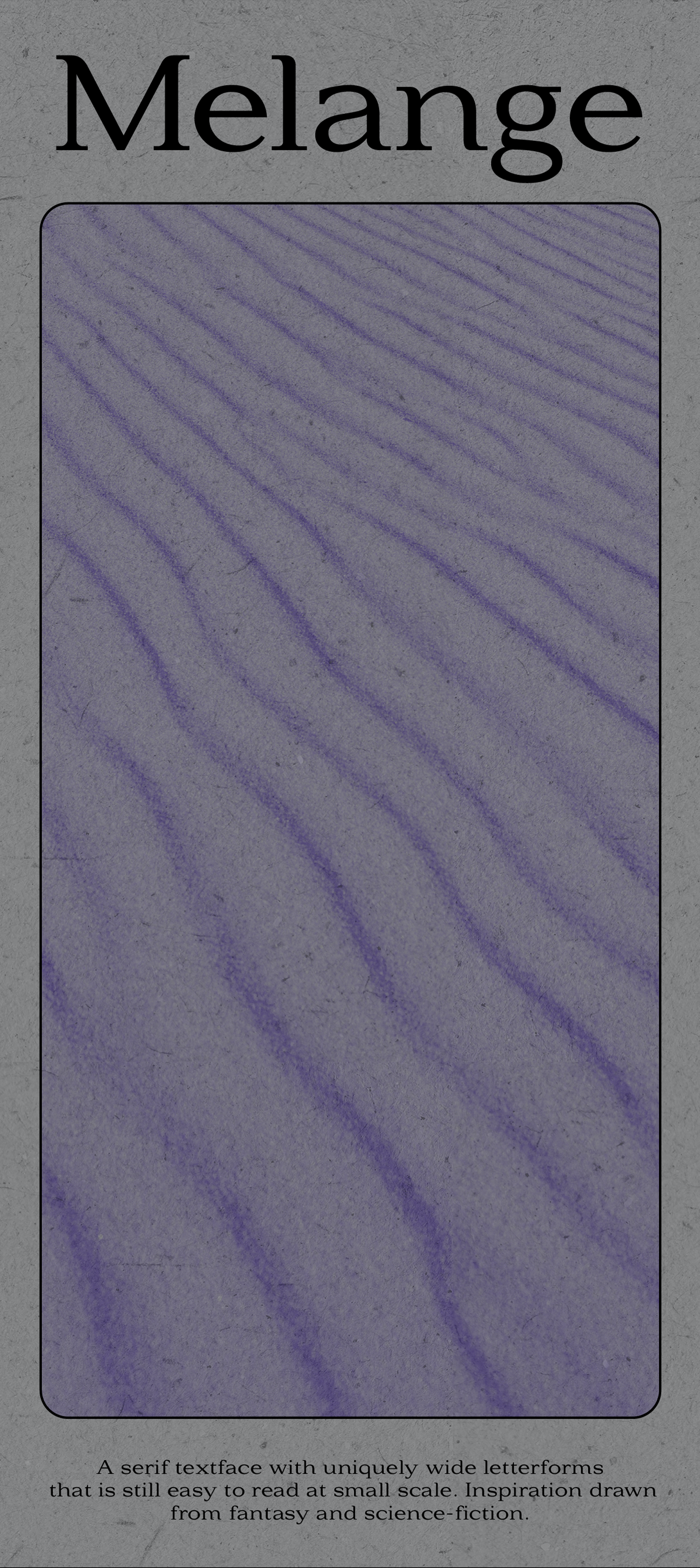 A serif face that walks the line between text and display. Intentionally wide and with quirks while still elegant and legible. Still a work in progress, always refining!